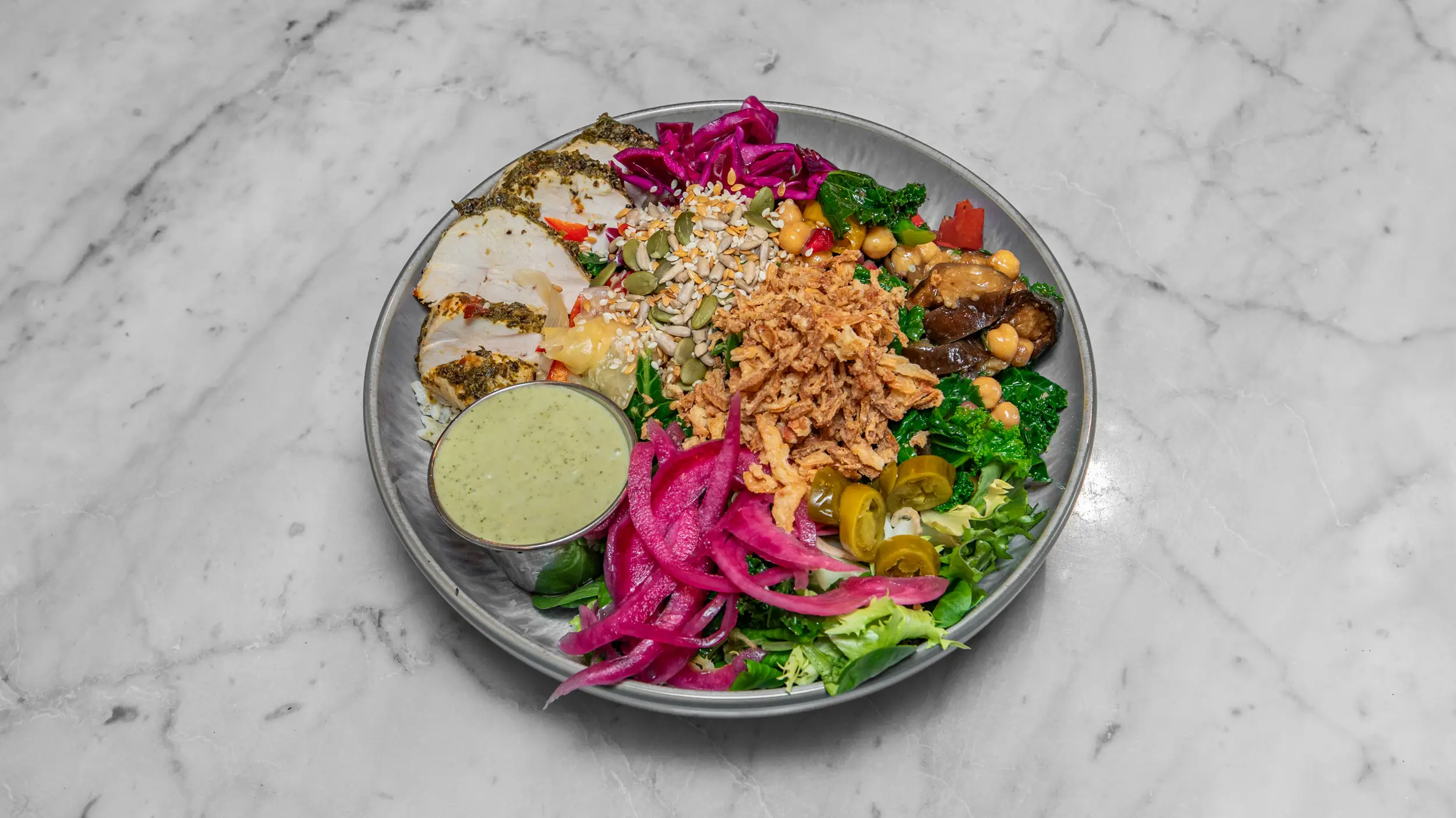 Miso aubergine, roasted peppers, chickpeas, kale, pomegranate, creamy herb & garlic dressing