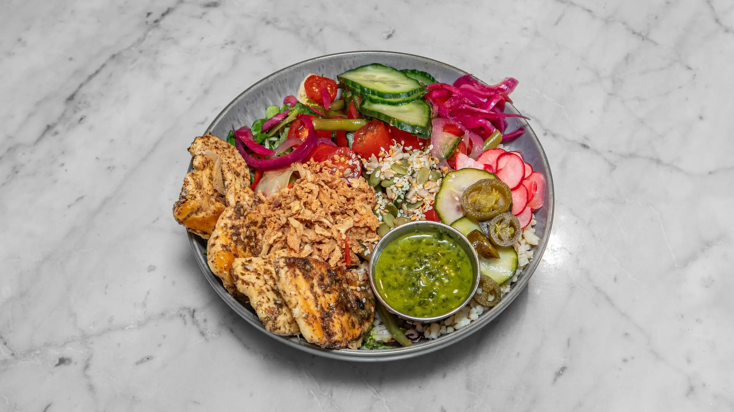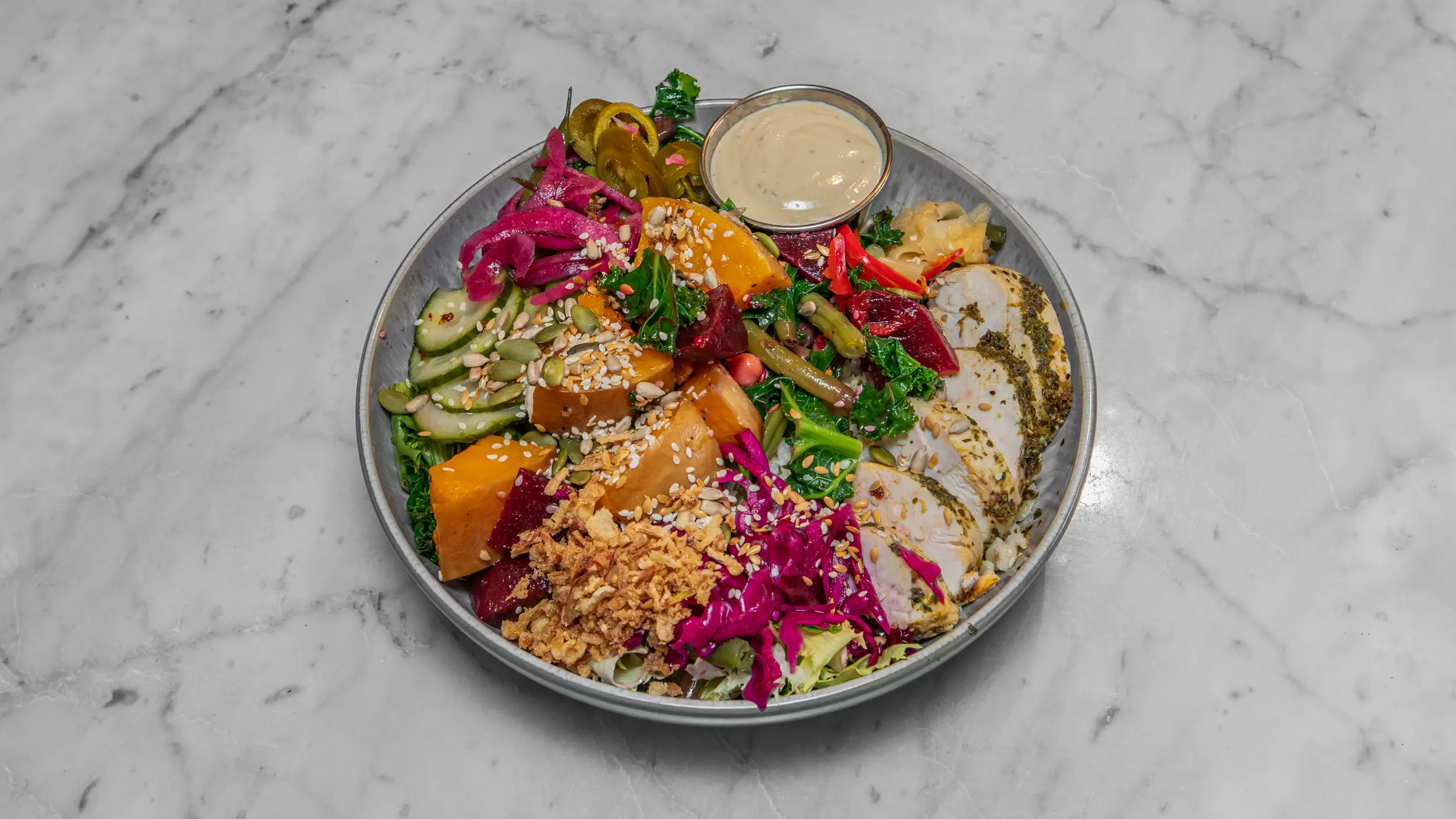 The salads are always vegetarian, with a choice of grain and leaf, then if you wish to include protein, salmon, chicken, goats cheese, avocado or Persian halloumi to add another dimension to the meal.